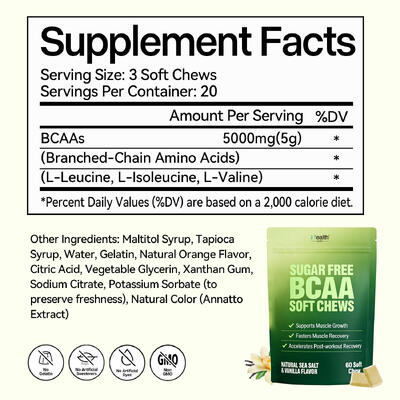 Premium sugar-free BCAA soft chews designed specifically for supplement brands, e-commerce sellers, and wellness startups. Each serving delivers 5000mg of high-potency BCAAs in a convenient, portable format.